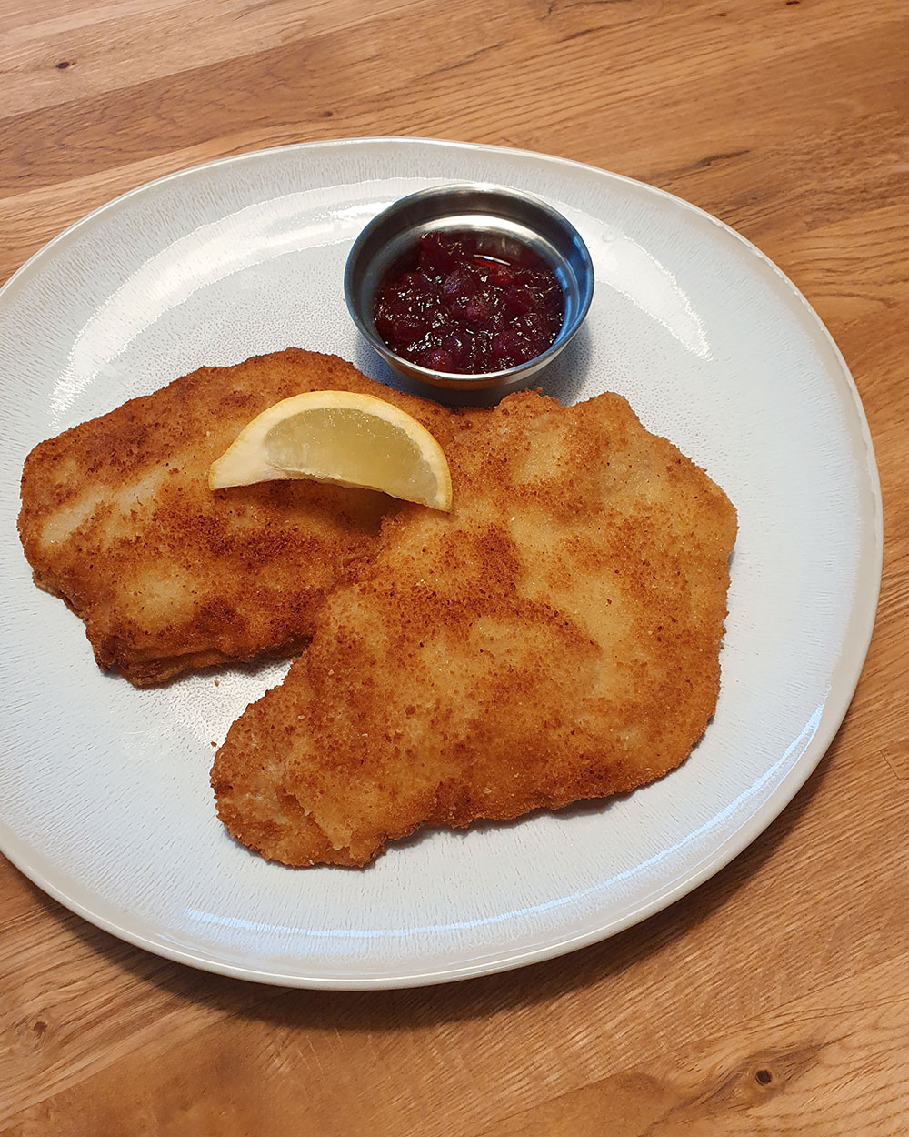 In Österreich wird das Wiener Schnitzel traditionell mit einem Zitronenschnitz und Preiselbeeren serviert.
