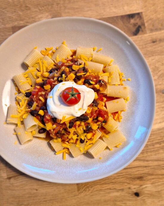 Diese einfache Tex Mex Pasta mit Bohnen, Mais, Tomaten und Chili wird mit Sauerrahm und Cheddar serviert zum echten Wohlfühlgericht.