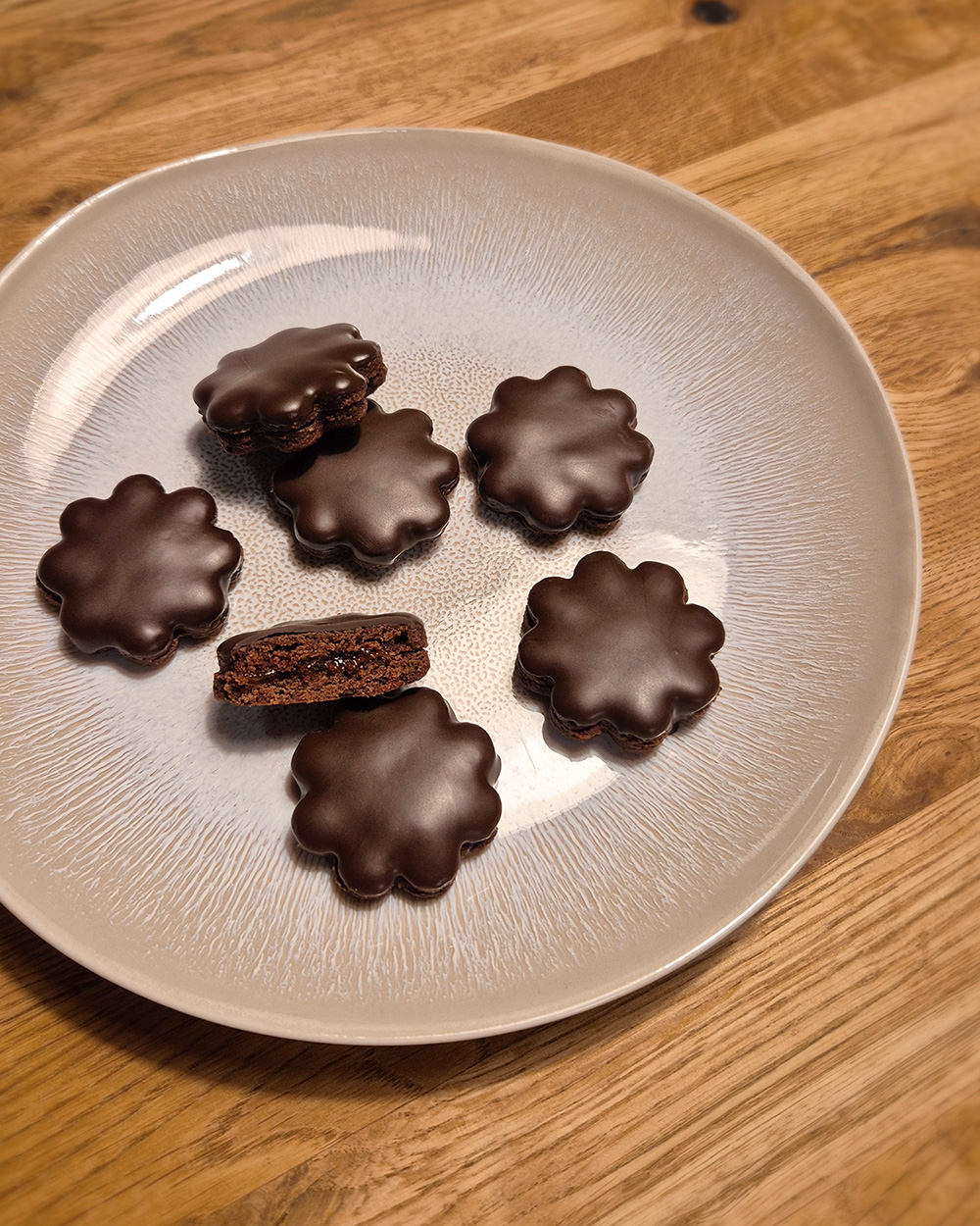 - Die Plätzchen mit der Oberseite in die Schokolade tunken und bei Raumtemperatur aushärten lassen.