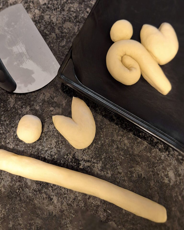 - Pro 500 g Mehl 4 Teigstücke für die Hasen abtrennen und dann formen:Das Teigstück halbieren. Aus der ersten Hälfte eine längliche Teigschlange formen und diese zu einem Körper einwickeln. Von der zweiten Hälfte ein kleines Stück für den Puschel abtrennen und rund formen. Aus dem restlichen Teig ein Oval für den Kopf formen und die Ohren bis über die Mitte einschneiden. Alle Teile auf dem Blech zusammensetzen und mit etwas Wasser oder Eiweiss als „Kleber“ vorsichtig andrücken.