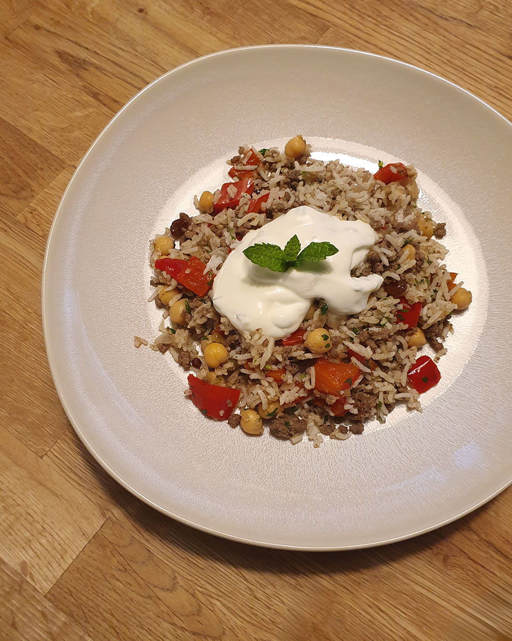 - Die orientalische Reispfanne mit der kalten Joghurt Sauce servieren.