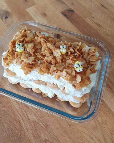 Luftige Vanillecreme, ein Hauch von Amaretto und Honig, gekrönt von einer knusprig-karamelligen Mandelhaube – all das macht das Bienenstich Tiramisu zu etwas ganz Besonderem.