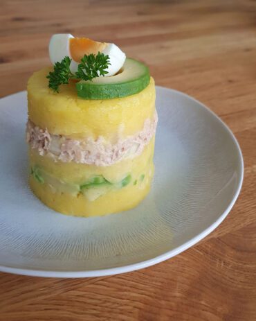 Causa Limeña de Atún ist eine kunstvolle peruanische Vorspeise aus Kartoffelpüree, Thunfisch-Mayonnaise und Avocado.