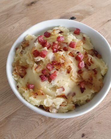 Kartoffelstock mit leicht säuerlicher Buttermilch, knusprig-würzigem Speck und süsslichen Röstzwiebeln ist echtes Wohlfühlessen.