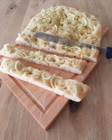 Die saftige Zwiebel-Focaccia passt hervorragend zu Antipasti Gemüse, Parmaschinken und Salami – ideal für eine mediterrane Vorspeise.