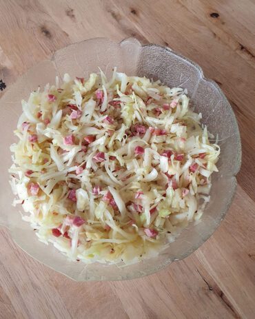 Der deftige Krautsalat mit Speck und Kümmel ist vor allem in Bayern und Österreich eine beliebte Beilage zu bodenständigen Gerichten.