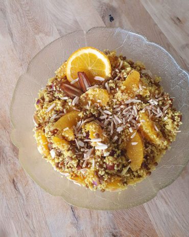 Fruchtiger Couscous Linsen Salat mit Orangen, Datteln und Mandeln