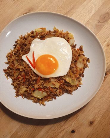 Nasi Goreng wird traditionell mit übrig gebliebenem Reis zubereitet. In diesem Rezept wird der Reis mit Hackfleisch, Weisskohl, Lauch und Karotten gebraten und mit Ketjap Asin, einer süssen indonesischen Sojasauce, verfeinert.