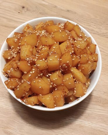 Koreanische Kartoffeln werden in einer süsslich-herzhaften Marinade geschmort, was Ihnen einen intensiven Umami-Geschmack verleiht.
