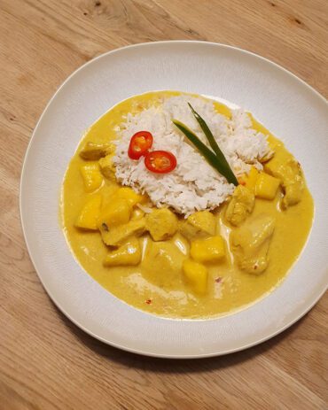 Indisches Mango Hähnchen vereint die Süsse von Mangos, die Schärfe von Chilischoten und indische Gewürze in einer cremigen Sauce, wobei das Hähnchen in einer Joghurtmarinade besonders zart wird.
