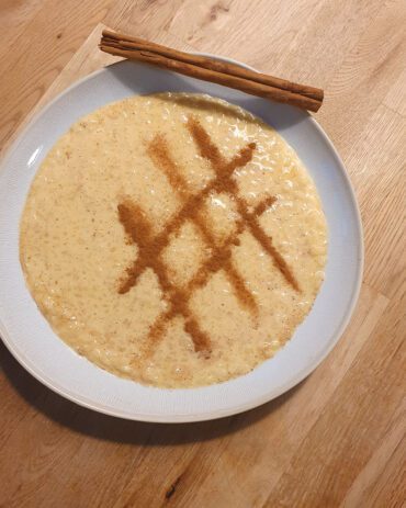 Portugiesischer Milchreis „Arroz Doce“ ist schön schlotzig und dank Eigelb wird er wunderbar cremig und leicht gelblich.