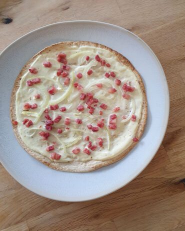 Dieser Flammkuchen mit einem knusprigen Tortilla Wrap als Boden ist blitzschnell und so einfach zubereitet.