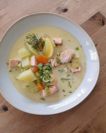 Die Lachs Suppe mit Lauch, Kartoffeln, Karotten, Sahne und Dill ist eine traditionelle Fischsuppe aus Finnland, namens Lohikeitto.