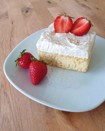 Der originale Tres Leches Kuchen aus Lateinamerika wird durch Tränken mit drei Sorten Milch, also Milchmädchen, ungesüsste Kondensmilch und normale Milch, so besonders saftig.