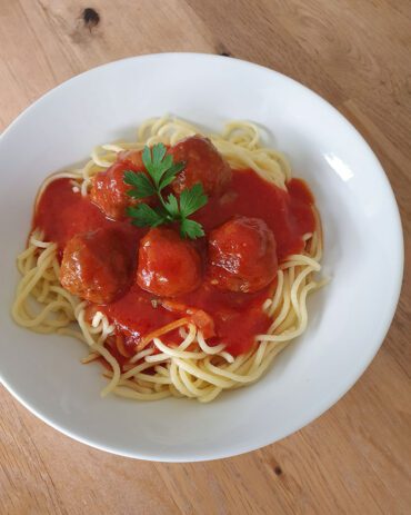 „Spaghetti con le polpette al sugo“ schmeckt der ganzen Familie. Die italienischen Hackbällchen mit Parmesan werden in Tomatensauce geschmort, wodurch sich alle Aromen wunderbar vereinen.