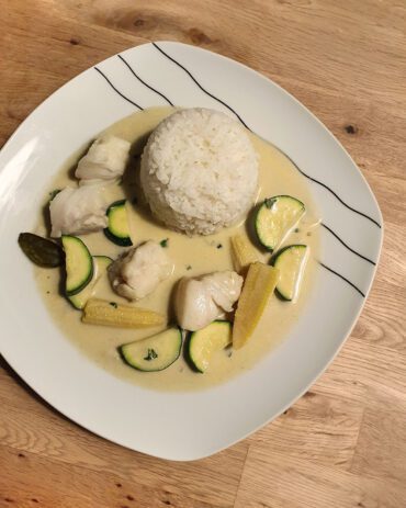 Grünes Thai Curry mit Fisch, Babymais und Zucchini ist ein einfaches asiatisches Blitzrezept. Mit grüner Currypaste, Kokosmilch und Thai Basilikum schmeckt das Curry ganz authentisch thailändisch.