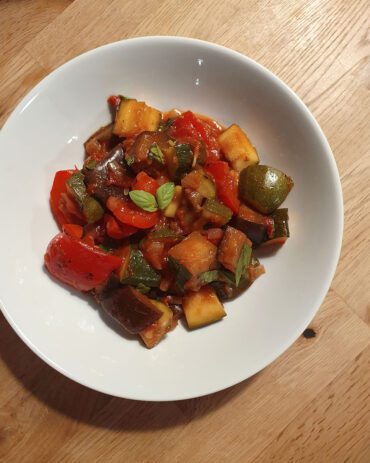 Das berühmte französische Ratatouille Gemüse mit mediterranen Kräutern wird durch langes Schmoren besonders lecker, wenn sich alle Geschmäcker vereinen.