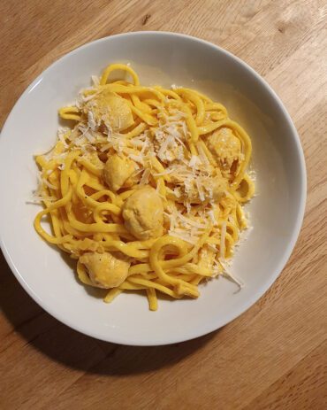 Die Pasta mit Hähnchen und Safransauce schmeckt absolut fantastisch und ist zudem blitzschnell und einfach zubereitet.