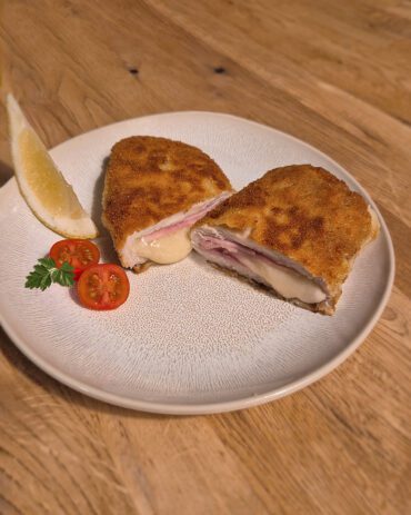 Ein saftiges Cordon Bleu verführt mit einer knusprigen, goldbraunen Panade und einer Füllung aus würzigem Schinken und Käse, der beim Anschneiden herrlich herausläuft.