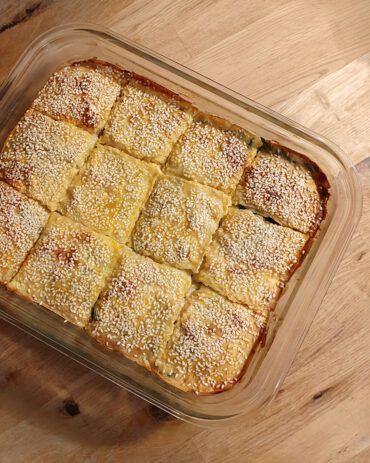 Der saftige Spinat Börek wird einfach in einer Auflaufform geschichtet und im Ofen gebacken.