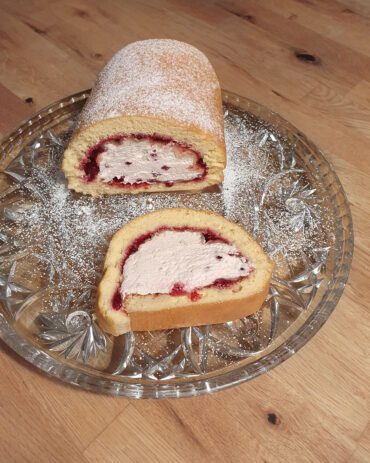 Die leckere Biskuitrolle mit Marzipan Preiselbeer Füllung und mit dem perfekten Biskuit ohne Risse sieht fantastisch aus und mundet auch so.