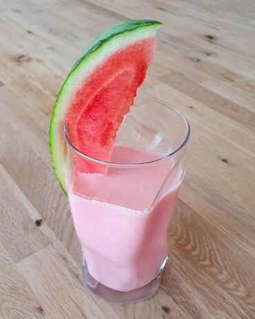 Der rosa Milchshake mit Wassermelone ist ein erfrischendes Sommergetränk mit viel Vitaminen und wenig Kalorien.