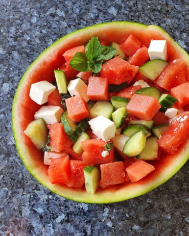 Der erfrischende Sommersalat mit Wassermelone, Feta, Gurke und Minze schmeckt wirklich fantastisch und kühlt den Körper ab.