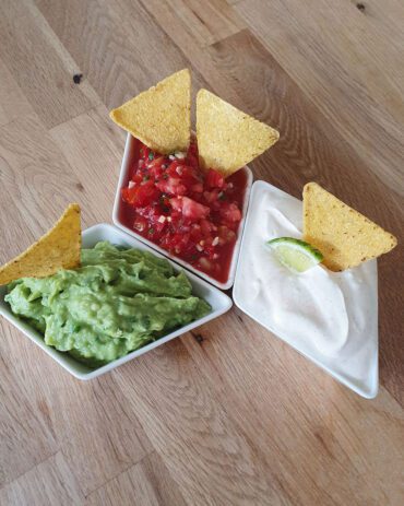 Tortilla Chips mit verschiedenen Tex mex Dips wie Guacamole, Pico de Gallo oder Salsa sind ein beliebter Fingerfood auf einer Party, zum Apéro und zum Knabbern vor dem Fernseher.