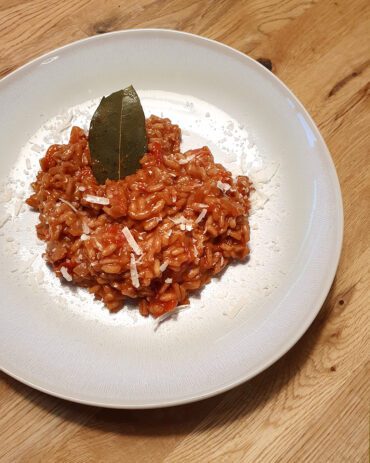 Der Tomaten-Risotto mit Rotwein hat ein schönes kräftiges Aroma. Er passt sowohl als Hauptgericht als auch als Beilage zu Fleisch.