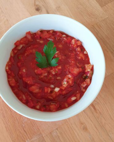 Acili Ezme ist ein scharfer türkischer Dip aus Tomaten, Paprika, Zwiebeln und Chili. Die Salsa wird traditionell als Mezze mit Fladenbrot oder zu Fleisch serviert.