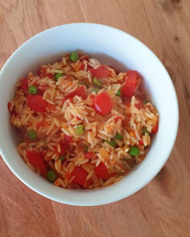 Djuvec Reis ist eine leckere Beilage aus der Balkanküche. Der Reis wird zusammen mit Paprika, Tomaten und Erbsen gekocht und mit Ajvar aromatisiert.