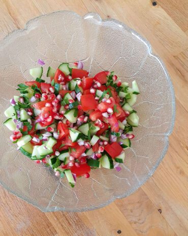 Der persische Shirazi Salat mit Tomaten, Gurken und Minze ist erfrischend und blitzschnell zubereitet. Im Iran wird der leichte Salat zu fast jedem Essen gereicht.