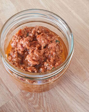 Pesto Rosso kann super gleich auf Vorrat zubereitet werden, denn es hält sich 3 Wochen im Kühlschrank.