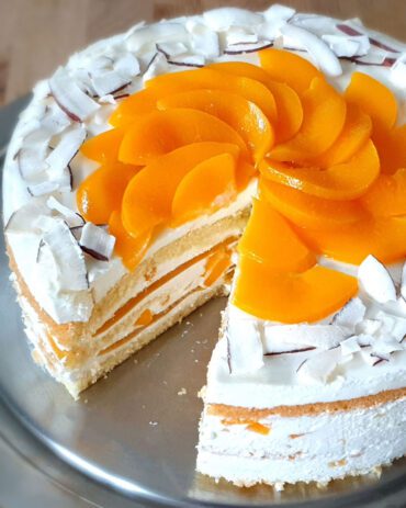 Die Pfirsich Maracuja Torte mit Quark ist erfrischend fruchtig. Der säuerliche Maracujaspiegel gleicht die Süsse der Pfirsiche perfekt aus und in Kombination mit Kokosnuss kommt Ferienfeeling hoch.