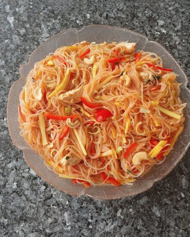 Der Glasnudelsalat süss-sauer mit Hähnchenfleisch, Mango, Paprika, Frühlingszwiebel und Cashewkernen ist ein leckeres ausgewogenes Sommerrezept.