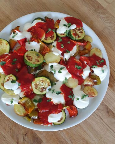 Mediterranes Ofengemüse mit Tomatensauce und Joghurt