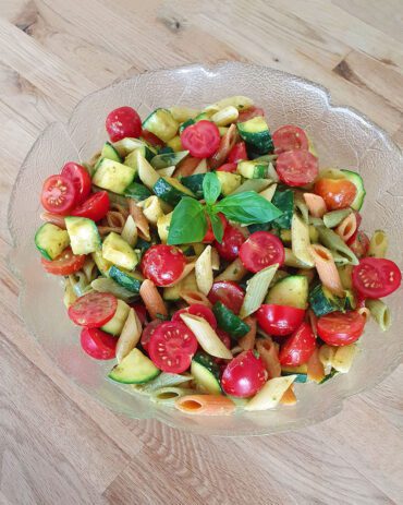 Der mediterrane Nudelsalat mit Pesto, Zuccchini und Tomaten ist ein leichtes Sommerrezept und eine leckere Grillbeilage.