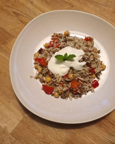 Leicht, aromatisch und voller orientalischer Aromen – diese Reispfanne mit Hackfleisch, Paprika, Kichererbsen, Rosinen und Joghurt ist das perfekte Sommergericht.