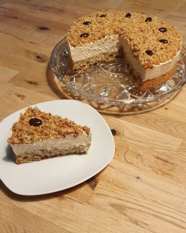 Diese dekorative Krümeltorte mit leckerem Mandel Biskuit mit Schokoladenstückchen und einer Mokka Sahnecreme ist auch für Tortenanfänger gut geeignet.
