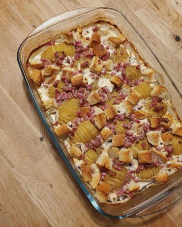 Dieser Auflauf mit Fächerkartoffeln ist ein ganz einfaches Ofengericht. Getoppt wird der originelle Kartoffelauflauf mit Brot, Speck und Rosmarin.