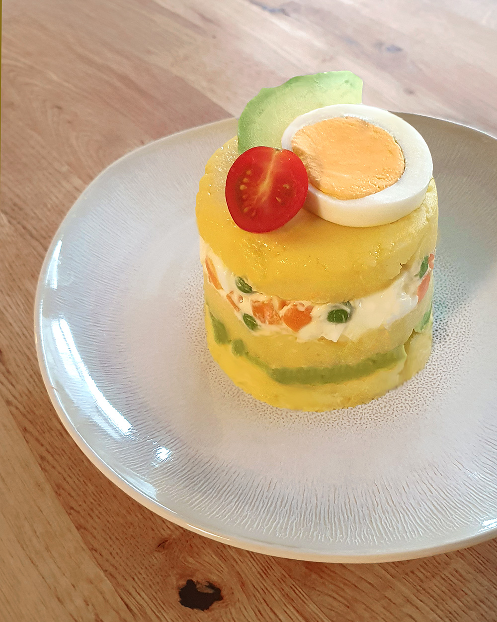 Gekochte mehligkochende Kartoffeln in die Teigschüssel geben und mit dem Flachrührer zu Püree verarbeiten. Dabei nur so lange wie nötig rühren, damit es kein Kleister wird. Traditionell werden peruanische gelbe Kartoffeln (papa amarilla) verwendet, die für ihre besonders cremige Konsistenz und leicht süssliche Note bekannt ist. Die beste Alternative sind mehligkochende Kartoffeln. Die Ají Amarillo Paste erhält man im lateinamerikanischen Spezialitätenladen oder online. Alternativ kann man gelbe Chilischoten entkernen, in Olivenöl andünsten und pürieren. Ganz besonders lecker wird die Causa mit selbstgemachter Mayonnaise. Causa lässt sich ganz einfach abwandeln! Die Basis ist immer das Kartoffelpüree – bei der Füllung kannst du kreativ werden. Klassisch mit Thunfisch, mit Hähnchen oder vegetarisch mit Ei: Hauptsache, alles wird schön cremig mit Mayonnaise vermengt.