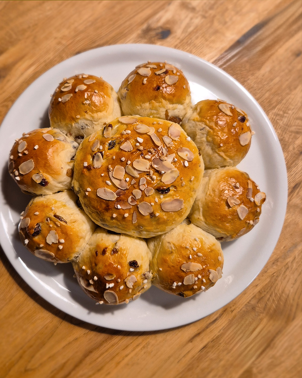 - Für einen Dreikönigskuchen 8 Kugeln à je 90 g formen.