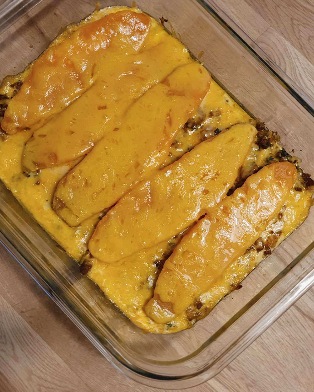 - Die gesamte Hackfleischmasse darüber verteilen.