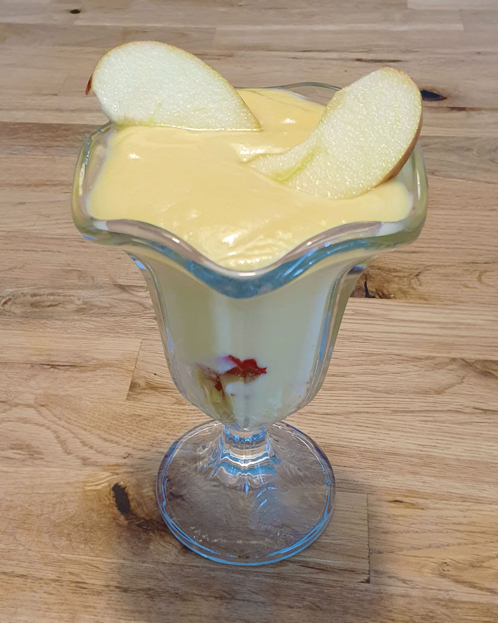 - Ein paar Apfelstücke in Gläser füllen, die Creme darüber verteilen und mit Apfelschnitzen garnieren
